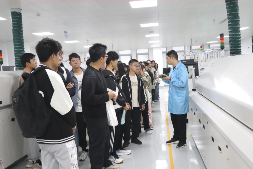 接下来,师生们来到生产车间,生产部经理孙志民向大家介绍了生产线的基本布局、工作流程以及安全生产的重要性。让学生们对生产企业的生产流程有了直观地认知和体验。